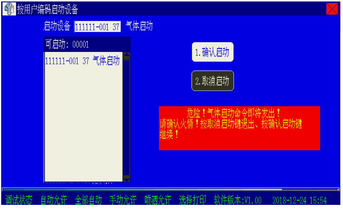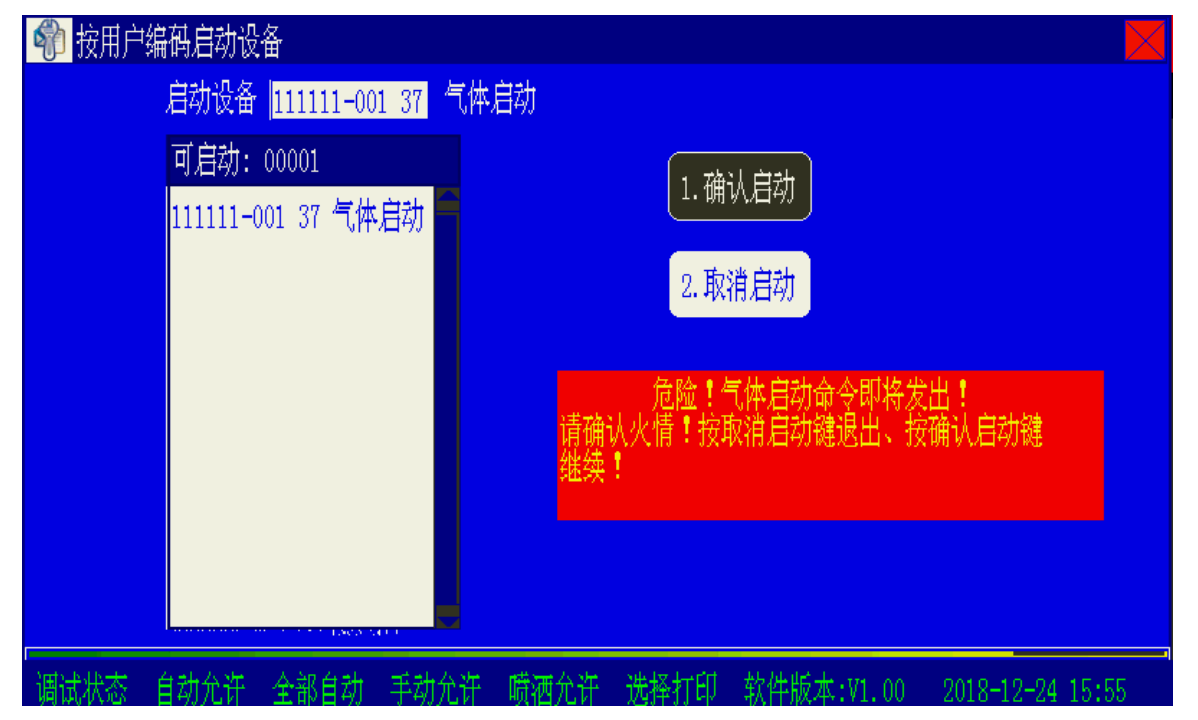 在圖2 所示界面下,選擇“取消啟動(dòng)”放棄;選擇“確認(rèn)啟動(dòng)”控制器立即發(fā)出啟動(dòng)氣體滅火設(shè)備命令!警告提示窗有時(shí)間限制,30 秒內(nèi)不進(jìn)行操作,放棄此次操作。