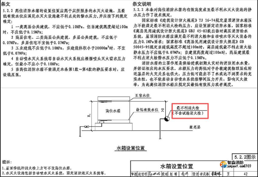 5.2.2 高位消防水箱的設(shè)置位置應(yīng)高于其所服務(wù)的水滅火設(shè)施,且更低 有效水位應(yīng)滿足水滅火設(shè)施最不利點處的靜水壓力,并應(yīng)按下列規(guī)定確定: